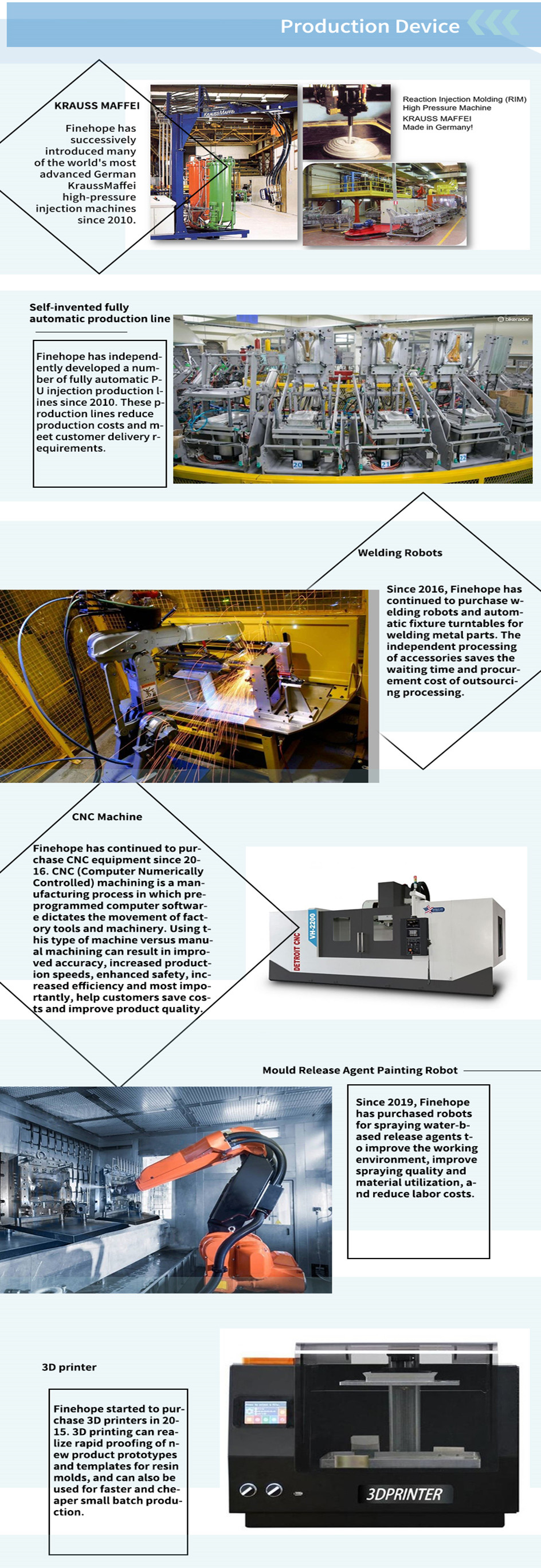 自動化設備の設計・製造力 自動化装置を設計および製造する Finehope の能力は、業界でも珍しいものです。新しい PU 射出混合装置の設計と生産ラインの自動化変換に参加することにより、中国の人口統計学的配当の競争の下で確実に削減されます。人件費は上昇し続けていますが、生産効率も向上し、人件費と材料費を削減できます。また、治具、特殊設備、自動金型などの主要設備の継続的な設計・製造能力も、ファインホープがあらゆる面で主導的な地位にある理由です。 |